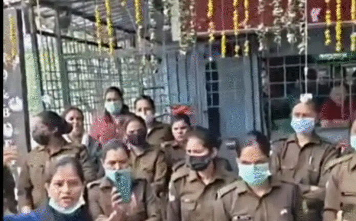 शराब की दुकान के बाहर मुस्तैद पुलिस फ़ोर्स की लेकर आंदोलनकारी नाराजगी प्रकट कर रहे हैं